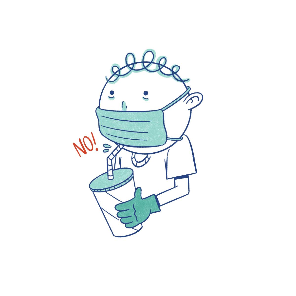 mask on and off without sterilizing it increases contamination. Wait until you get home to eat or drink. Illustration by Karly Andersen